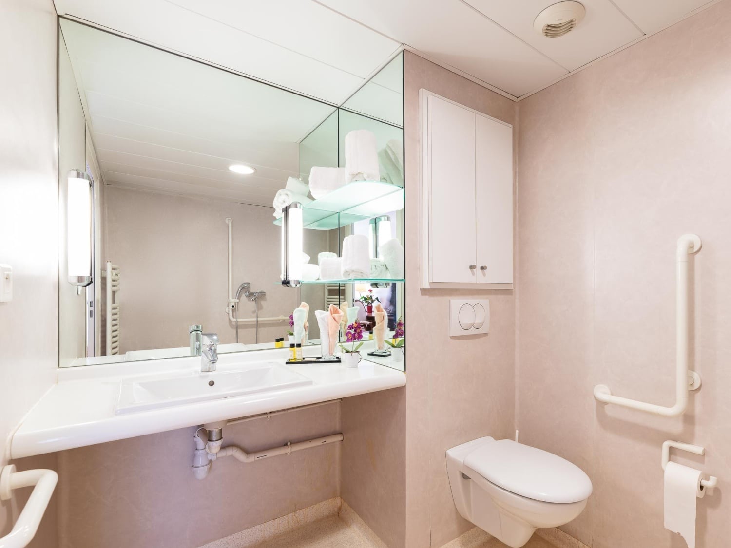 Chambres simples, doubles, communicantes équipées : bureau, téléphone, armoire/penderie, minibar, appel-malade dans la chambre et salle de bain